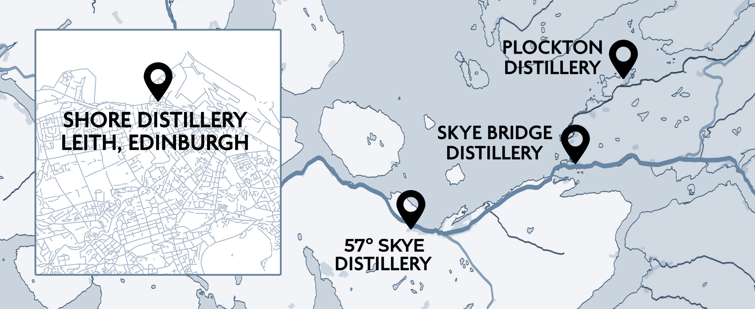 Discover the heart of our craft through our four unique distilleries. 57° SKYE Distillery, rooted in tradition in the bustling heart of Skye; Skye Bridge Distillery, standing proudly at the gateway to the island; Plockton Distillery, nestled in a charming coastal village on the mainland; and Shore Distillery, in Leith, Edinburgh, bringing the Highlands and the Isle of Skye to the city. Each location brings its own character, landscape, and story to the spirits we create.